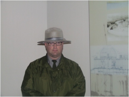 Berger looks like a Hollywood-version of a park ranger. He is a tall, square-jawed solid-looking man with dark-framed eyeglasses. Dressed in a long green rain padded raincoat, green shirt, green tie, comfortable, weatherproof shoes and a beige ranger hat. He did not wear gloves nor carry an umbrella. Berger looked neat and ready to take on the elements and answer any questions.