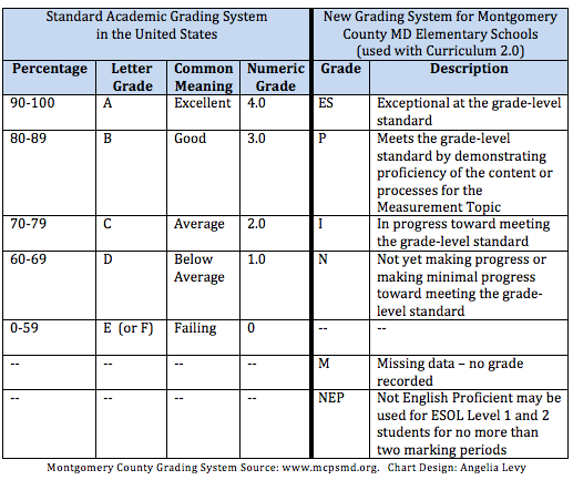 The new grading system is part of the implementation of Montgomery County’s Curriculum 2.0 – based on the Common Core education standards. (Note: MCPS began rolling out the new curriculum on a grade-by-grade basis in 2009-2010 with some kindergarten classrooms at participating Curriculum 2.0 pilot schools). At the start of the 2014-2015 school year, grades K-6 will use Curriculum 2.0 and grades 7-12 will continue with its previous MCPS standard curriculum (AKA ‘Curriculum 1.0’ ). Therefore, by Fall 2020 Curriculum 2.0 will be used by grades K-12 in Montgomery County.