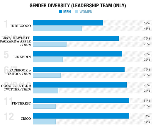 That may be true, but it doesn’t negate the fact that women have had a tough time in the technology industry, let alone reaching managerial echelons in the field. In the past few months several tech giants such as Google, Apple and Facebook finally released their employee demographics in response to grumblings regarding the tech industry’s lack of gender and racial diversity. As was expected the majority of tech employees are white and male (see side charts; other charts available at Fortune Magazine).