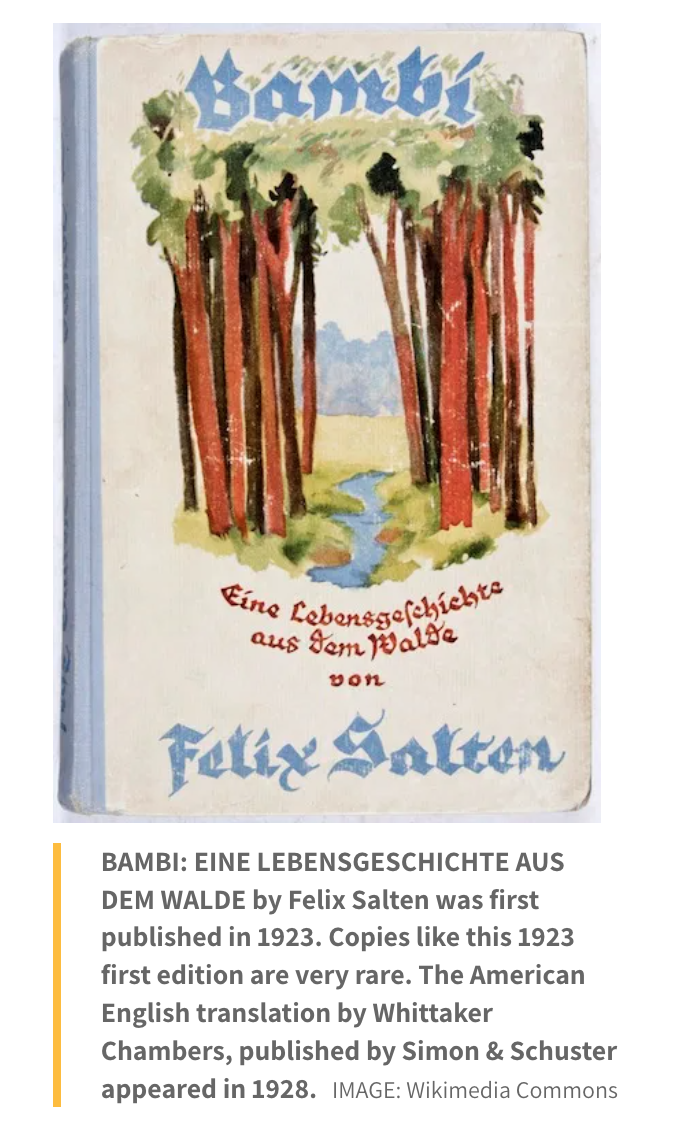 As described by John Wills for the Library of Congress, “[Bambi, the movie] is based on “Bambi, A Life in the Woods” (1923) by Austrian Felix Salten that offered a sentimental yet critical take on human-nature relations for a largely adult audience.” In April 1937, Walt Disney “acquired rights to the title from MGM director Sidney Franklin, who had failed to turn the story into a working live-action movie.”
